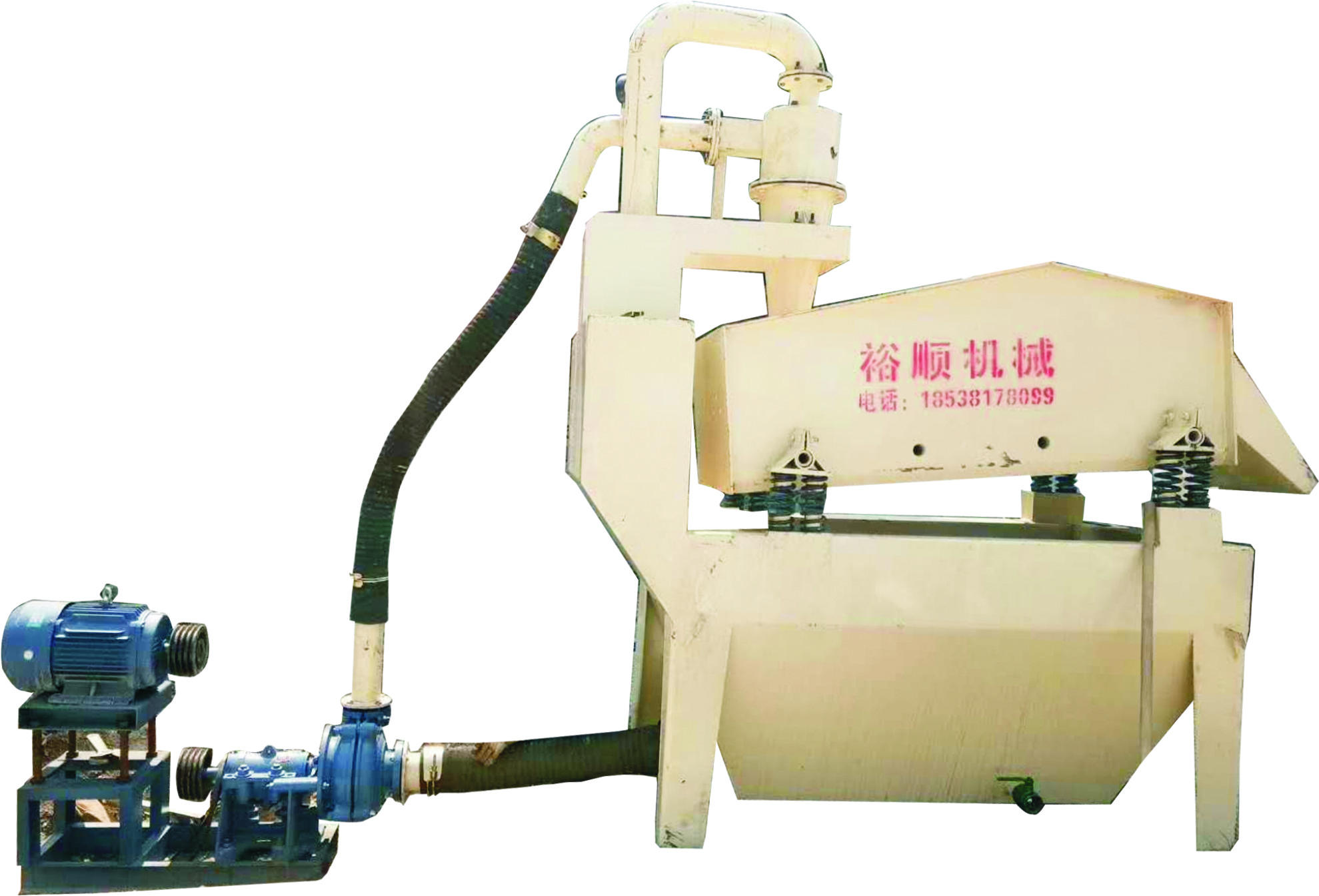 細(xì)砂回收機(jī)是由電機(jī)、渣漿泵、旋流器ZKR直線振動篩、清洗槽、返料箱等組成。泵將砂水混合物輸送至旋流器,離心分級濃縮的細(xì)砂經(jīng)沉砂嘴提供給振動篩,經(jīng)振動篩脫水后,細(xì)砂與水有效分離,少量細(xì)砂、泥等經(jīng)返料箱再回到清洗槽,清洗槽液面過高時,經(jīng)出料口排出。
